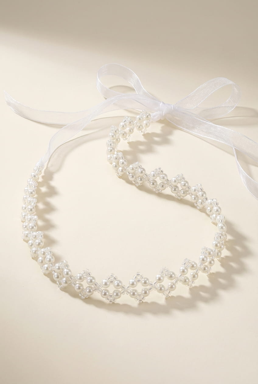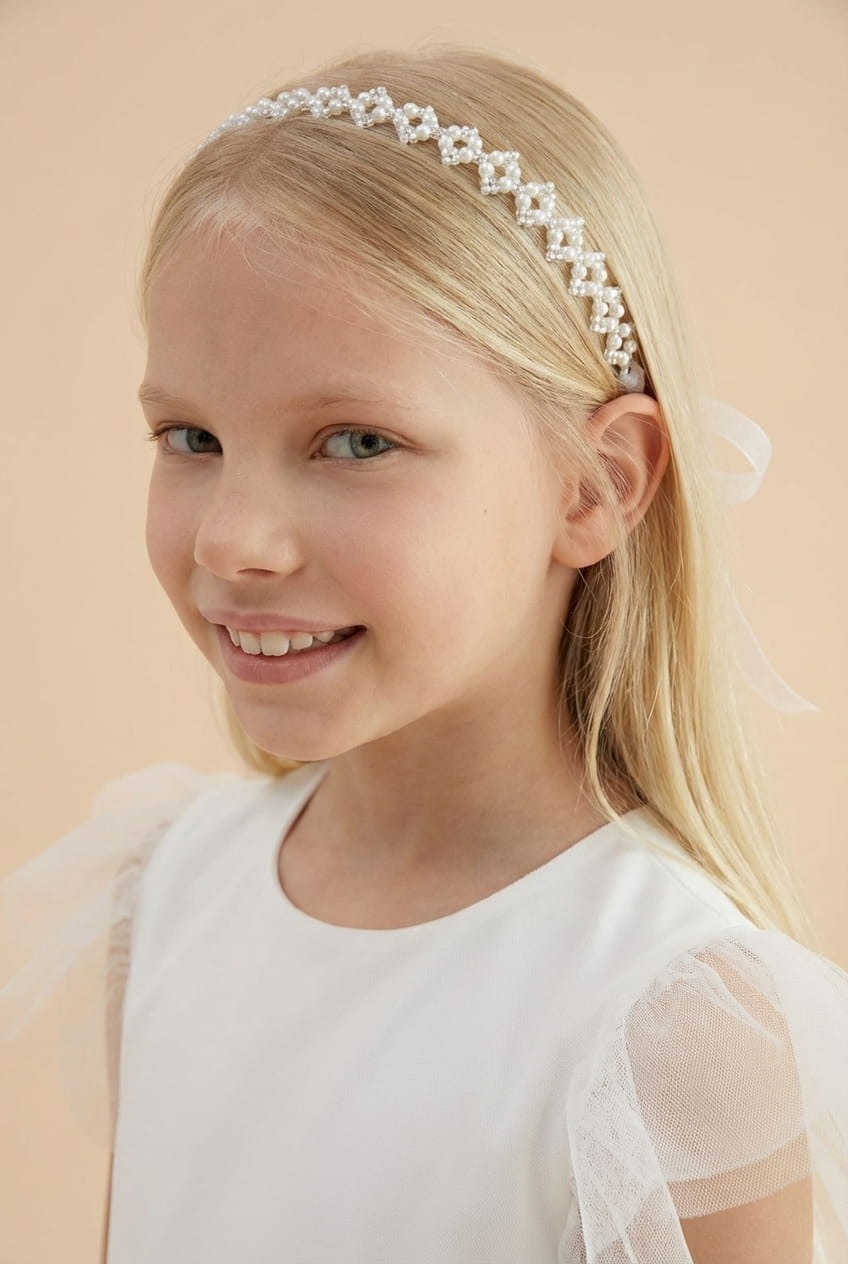 Valkoinen helmillä koristeltu hiuskoriste tytöille – Juhlava seppele organzanauhoilla