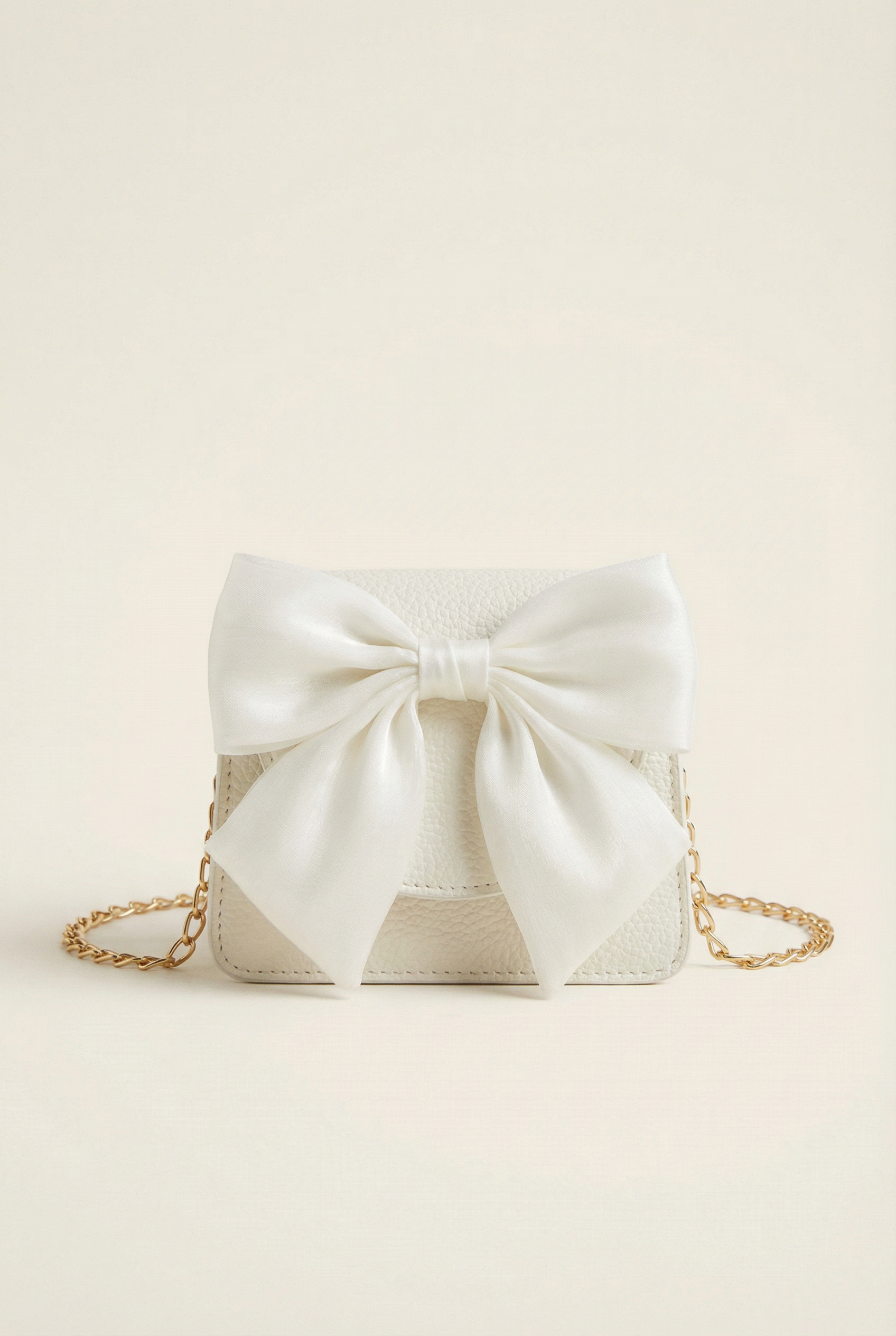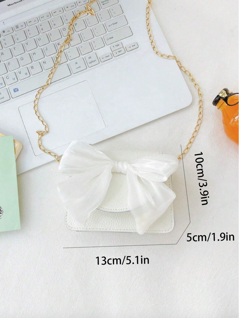 Elegantti valkoinen laukku tytöille suloisella rusetilla ja kultaisella ketjulla