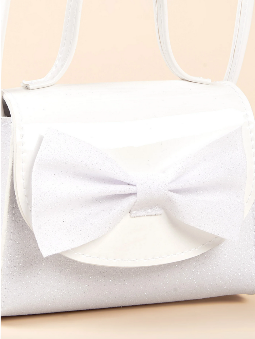 Korkealaatuisesta materiaalista valmistettu laukku heijastaa kauniisti valoa herkän kiiltonsa ansiosta, ja se on sekä kestävä että käytännöllinen. Sen valkoinen väri yhdistettynä hienostuneeseen, koristeelliseen yksityiskohtaan, kuten rusettiin, antaa sille ainutlaatuista luonnetta, joka varmasti miellyttää jokaista pientä muotitietoista.